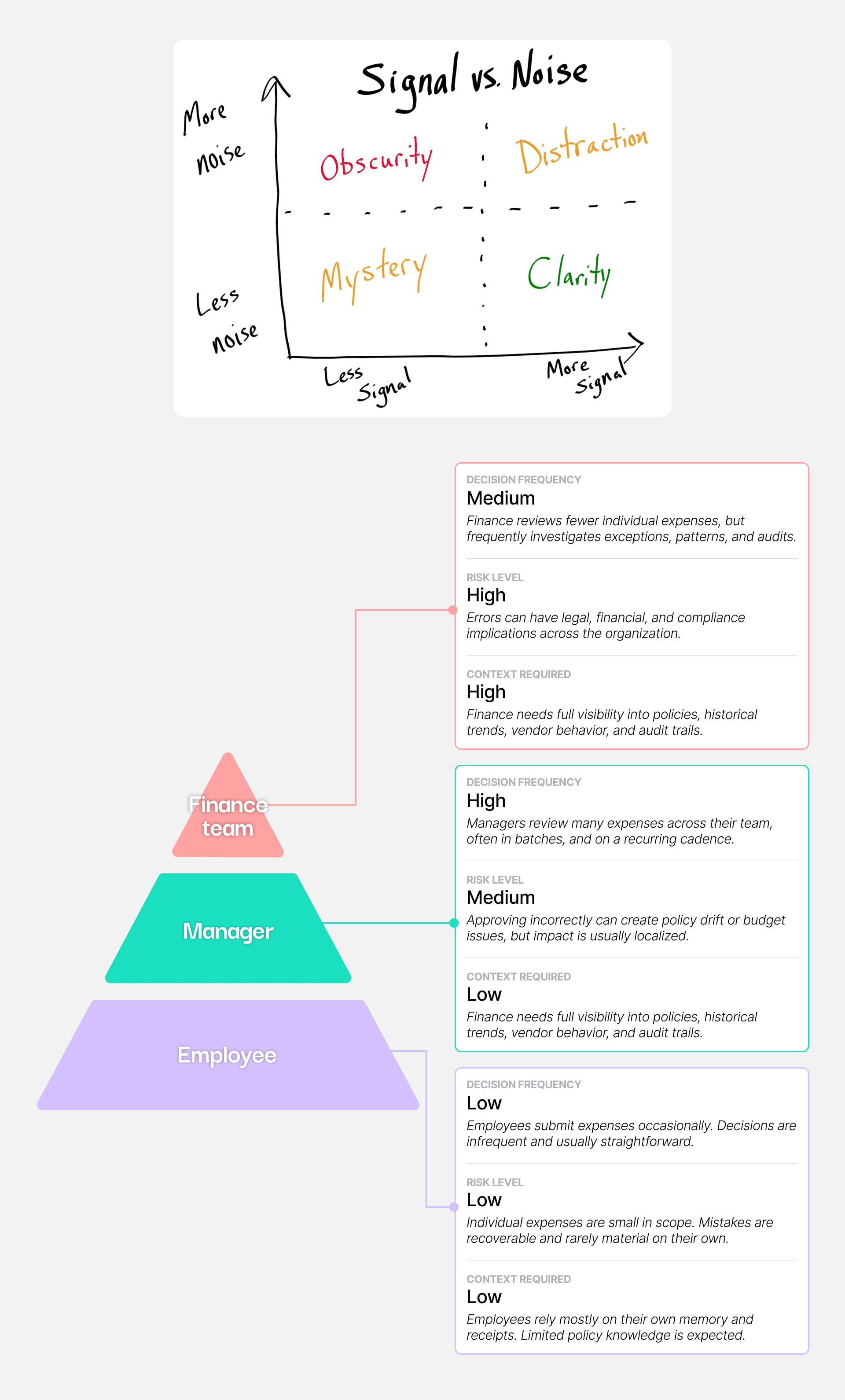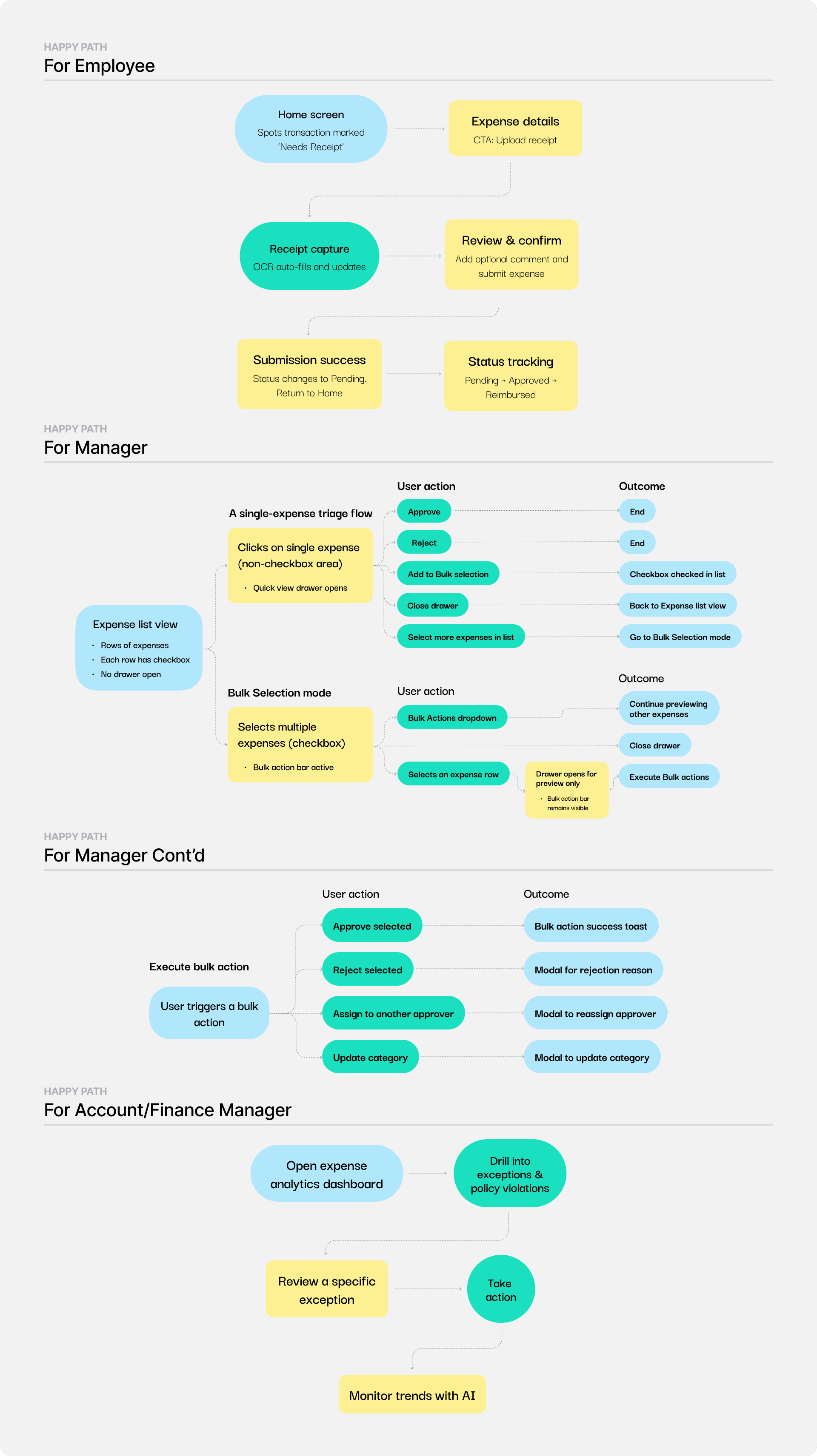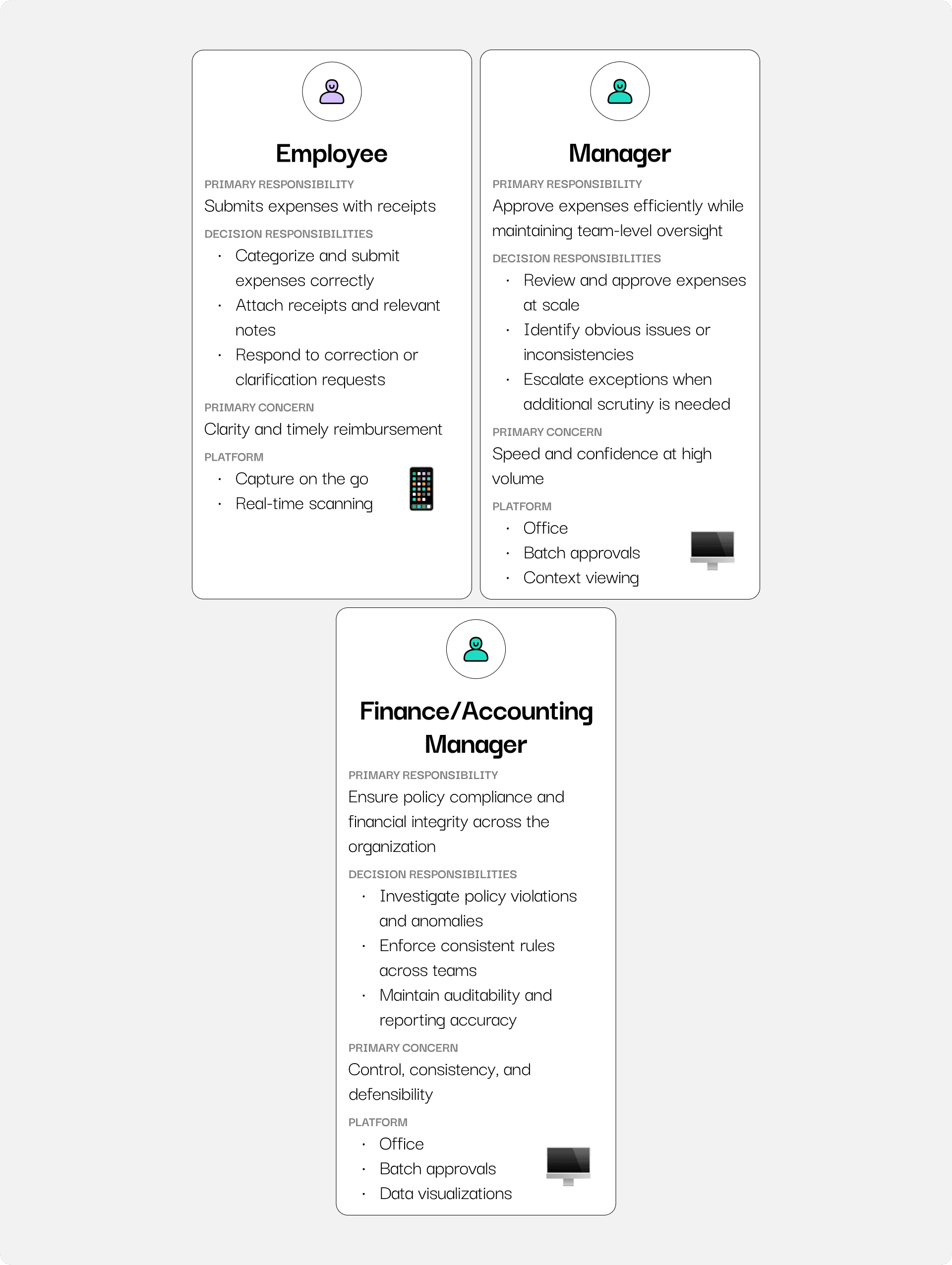 The work focuses on designing scalable UX patterns for high-volume expense management, emphasizing clarity, exception handling, and decision confidence for different user roles.