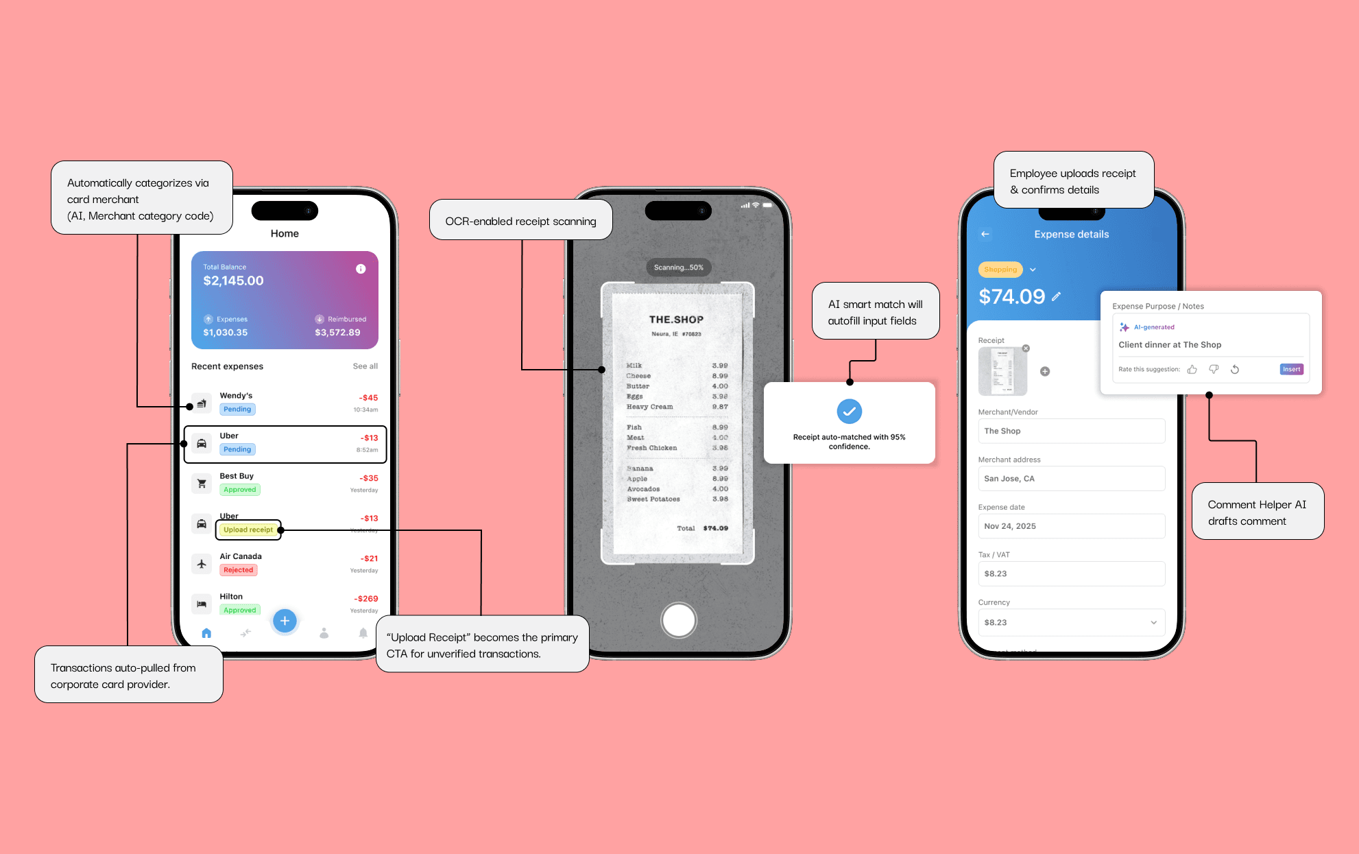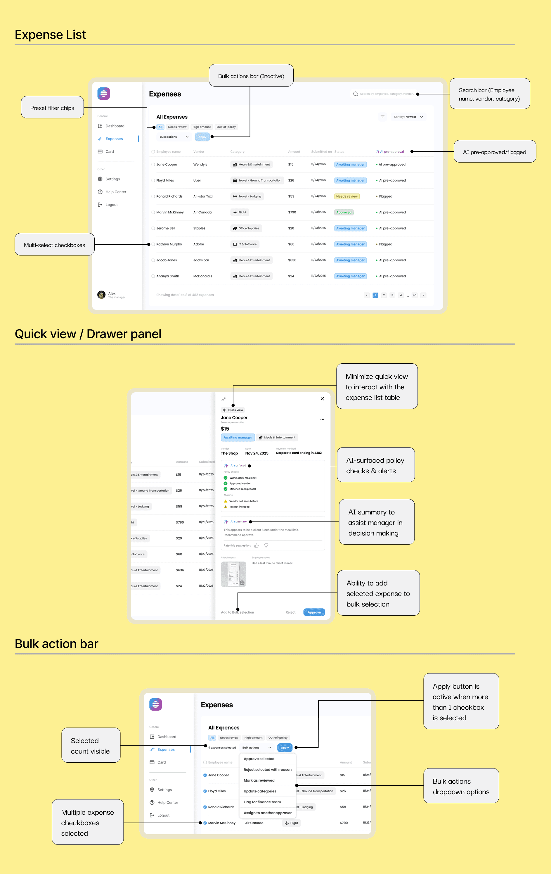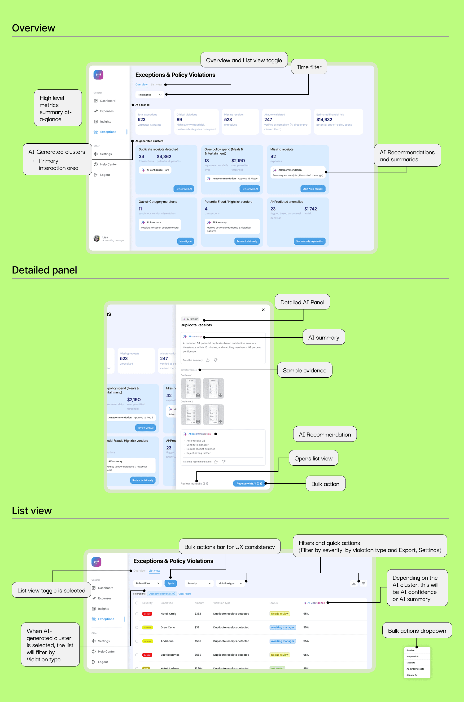 The work focuses on designing scalable UX patterns for high-volume expense management, emphasizing clarity, exception handling, and decision confidence for different user roles.
